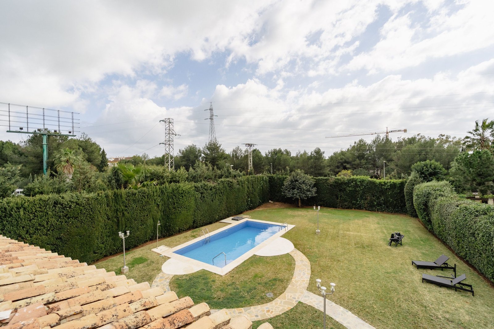Down the stairs to the large garden, we can access the pool and ample space to relax and enjoy the secluded private gardens. This is a lovely sunny area and a great place to relax in privacy.