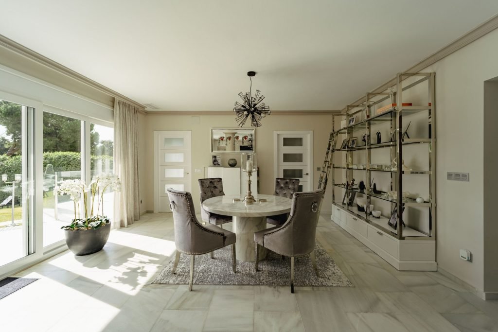 The lounge is spacious and also bright thanks not only to the white and light shades used, but also the two double width glazed doors that flood light to the entire area. Regarding the doors and windows, the entire property benefits from new windows and doors, apart from the grand old entrance. Returning to the lounge description, the east wall has been devoted to a stunning two-meter fireplace, with television above and feature shelving to each side.