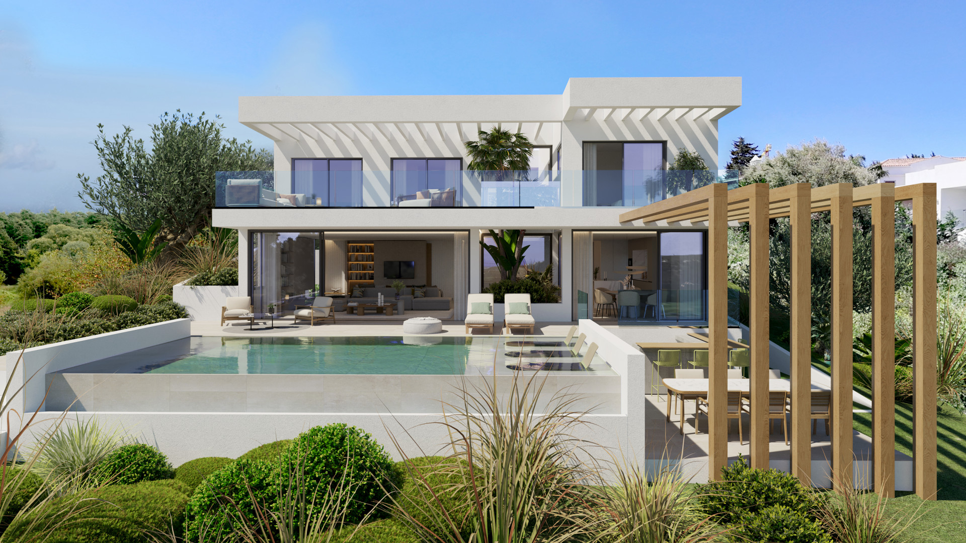 Los espacios interiores se abren de forma fluida a amplias terrazas y amplios jardines privados, que gozan de impresionantes vistas panorámicas a Valle Romano y al mar Mediterráneo. Cada vivienda cuenta con 3 dormitorios, 3 baños, piscina privada y, en algunas tipologías, un sótano personalizable, ofreciendo infinitas posibilidades para crear el espacio ideal según tus necesidades.