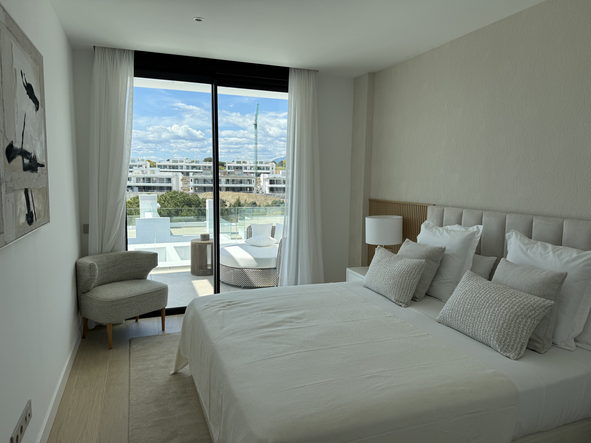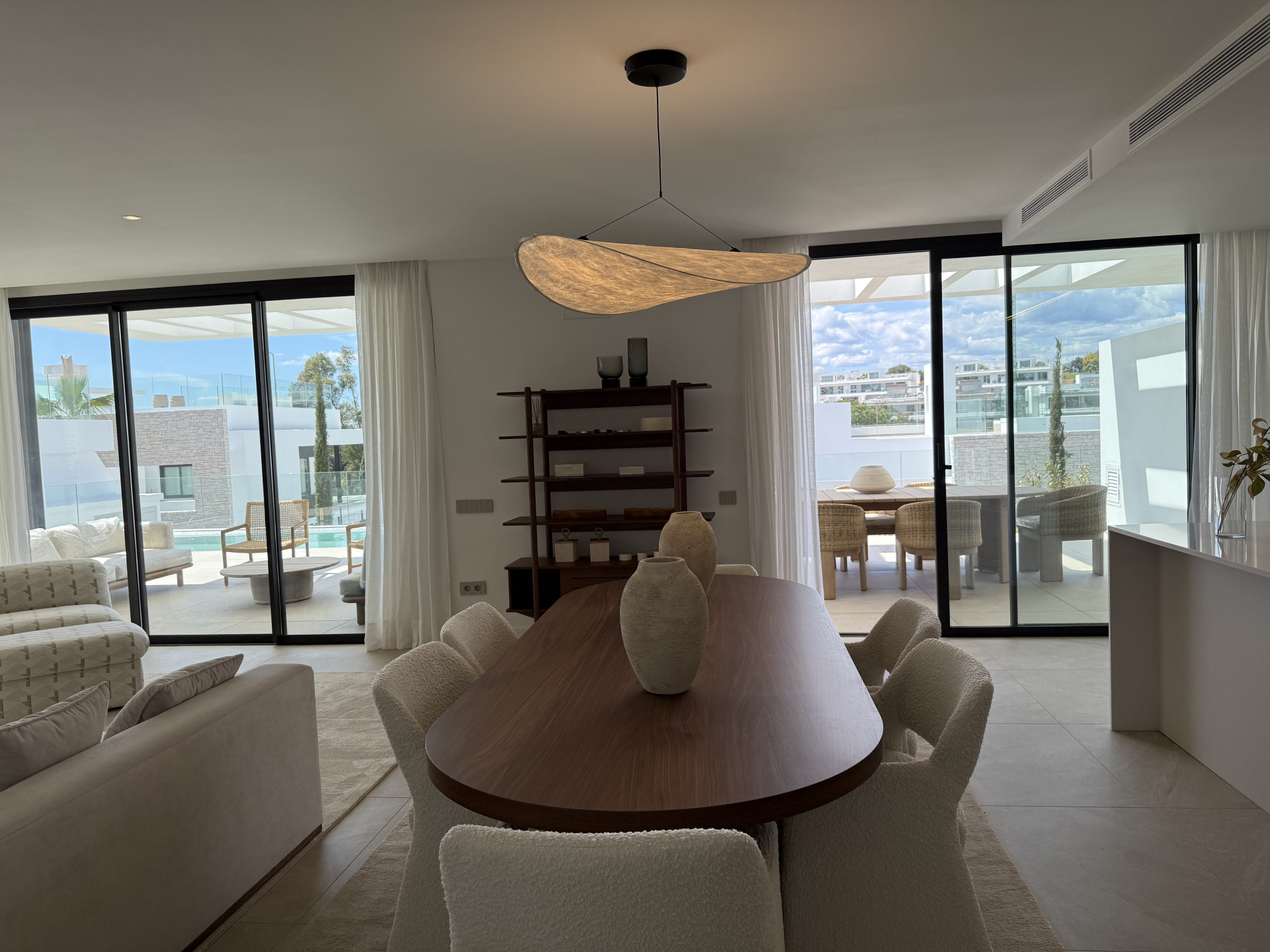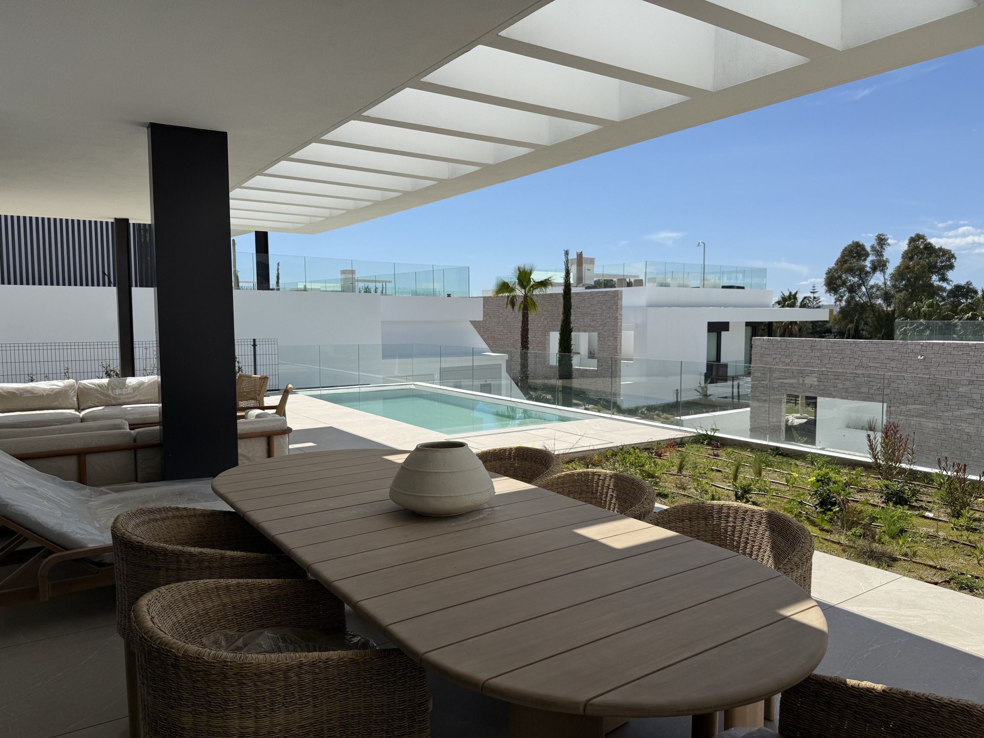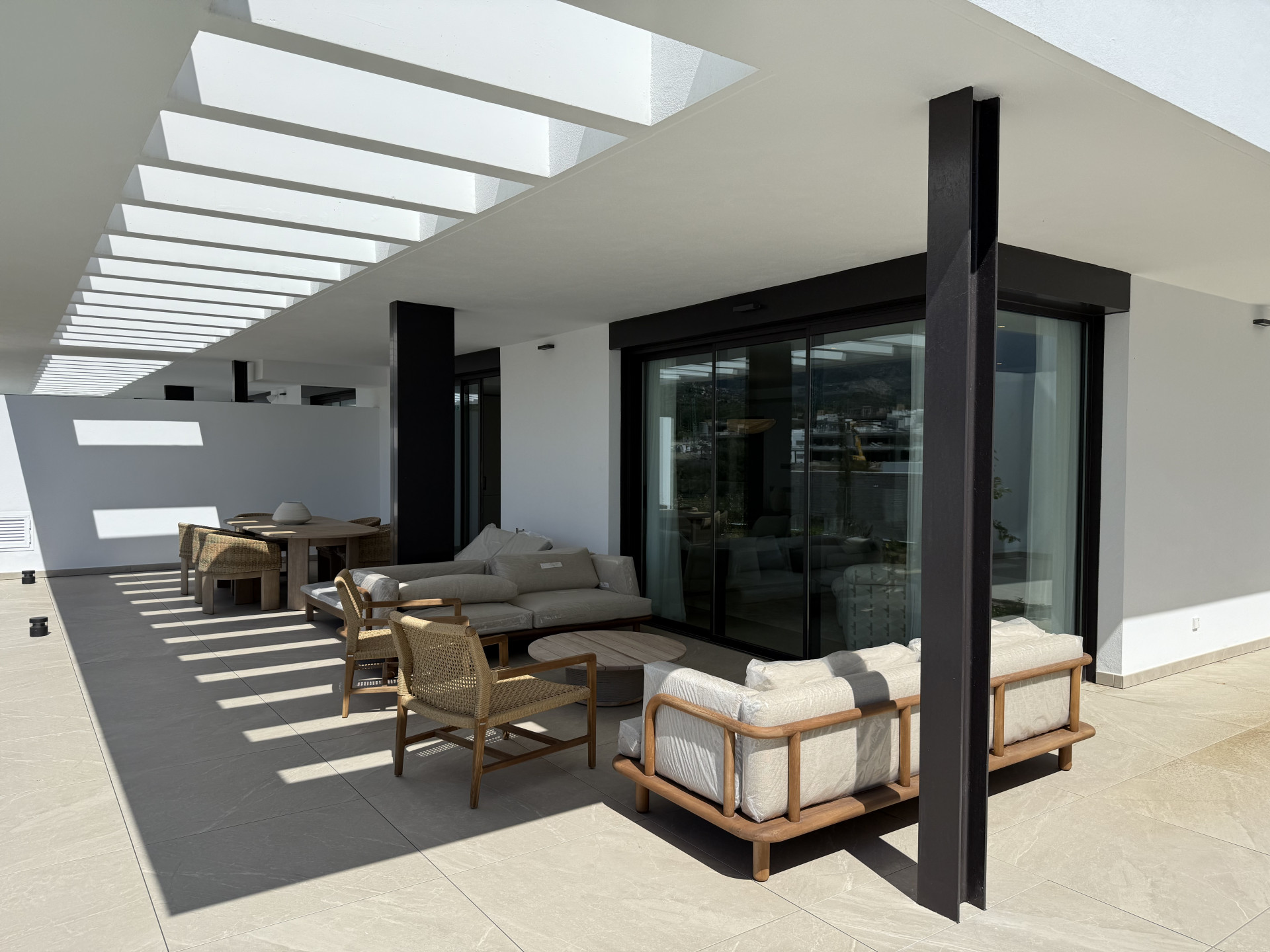 Los espacios exteriores son igualmente impresionantes, con una piscina privada climatizada que invita a disfrutar de momentos de relax durante todo el año. El jardín privado añade un toque de naturaleza y privacidad, mientras que las terrazas descubiertas ofrecen el lugar perfecto para disfrutar de las vistas al mar y al golf. La villa también cuenta con acceso a un garaje comunitario, proporcionando comodidad adicional.