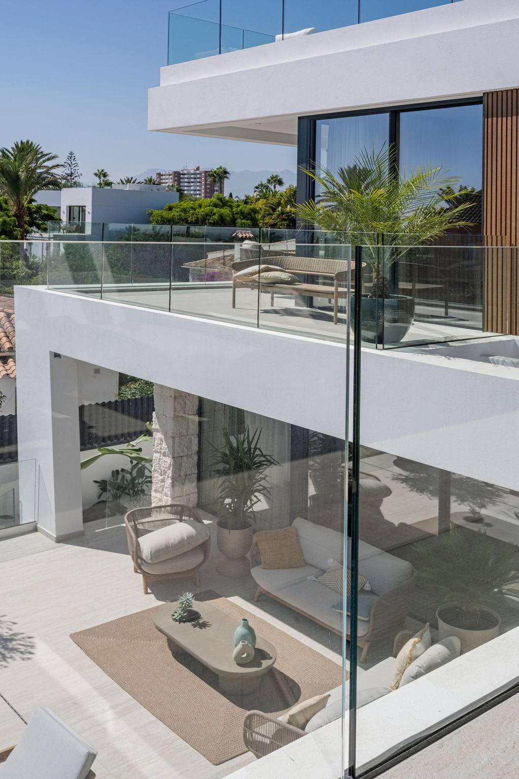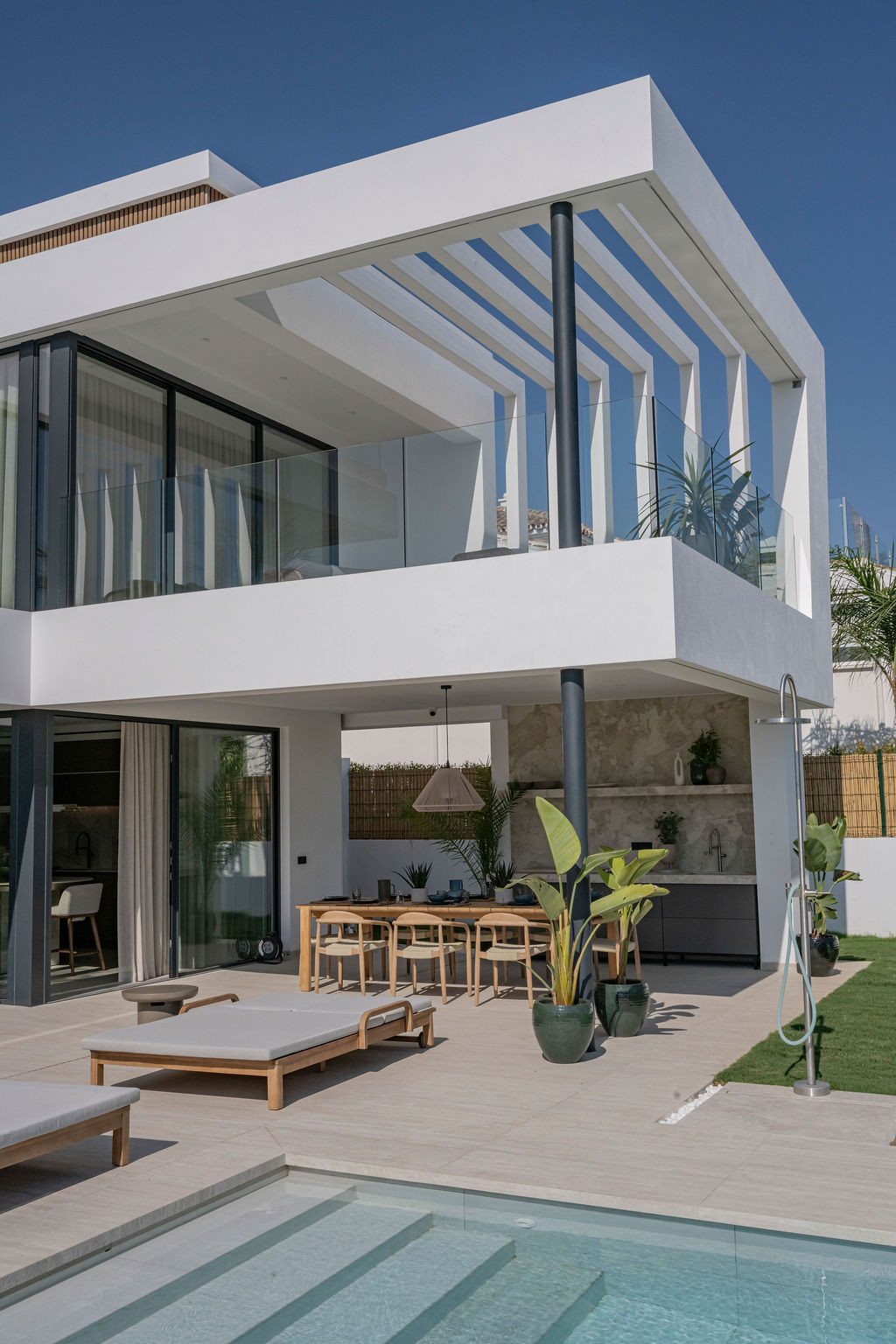 La villa cuenta con una superficie construida de 417 m² sobre una parcela de 640 m², además de una generosa terraza de 104 m². Se distribuye en cuatro dormitorios y cuatro baños, proporcionando amplitud y privacidad para toda la familia o invitados. El salón principal conecta con una terraza privada y una zona de barbacoa, ideal para reuniones al aire libre. La propiedad está rodeada de un exuberante jardín privado y dispone de piscina particular, permitiendo disfrutar de momentos de relax con vistas al mar y al jardín.