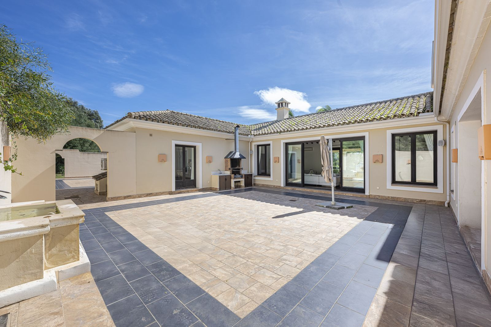 La villa cuenta con una superficie construida de 600m² sobre una amplia parcela de 2,500m², ofreciendo espacios generosos y bien distribuidos. Dispone de cinco dormitorios y seis baños, todos diseñados con un estilo moderno y acabados de primera calidad. La propiedad se encuentra en excelente estado y está completamente amueblada, lista para entrar a vivir. La cocina, totalmente equipada, incluye electrodomésticos de última generación y se complementa con un práctico lavadero. Además, cuenta con un salón acogedor que incluye una chimenea, ideal para las noches más frescas.