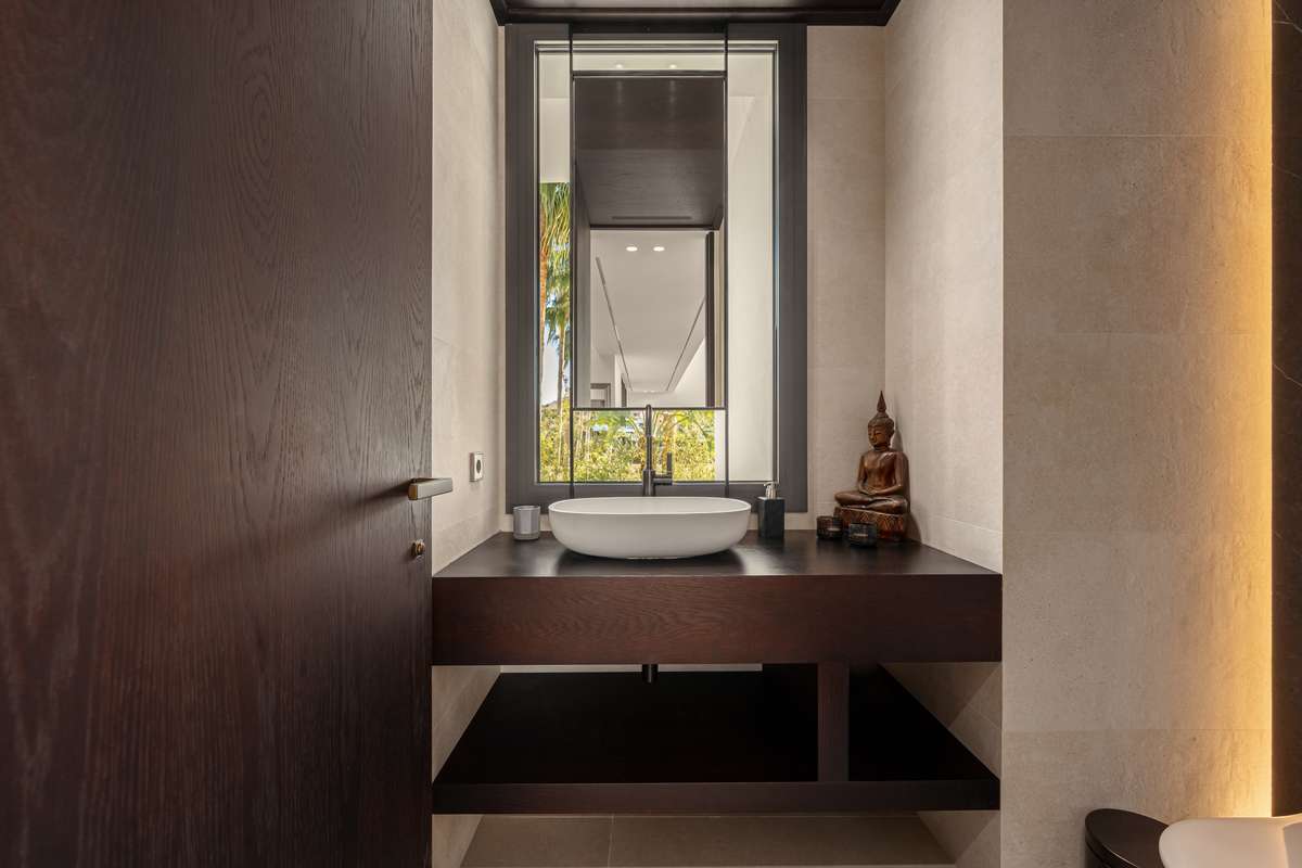 The interior includes bright, open-plan living areas, a fully equipped kitchen, 4 serene bedrooms, and 5 bathrooms. Special features such as a Dolby surround sound system, a cozy fireplace, glass doors that integrate indoor and outdoor living, and additional spaces such as a basement, sauna, indoor pool, gym, solarium, and home theater further enhance the villa’s appeal. There is also extra space available to create a guest room or whatever your desire.