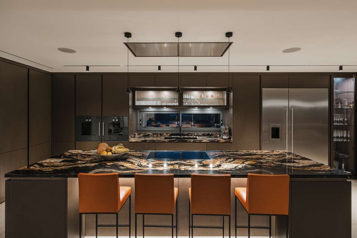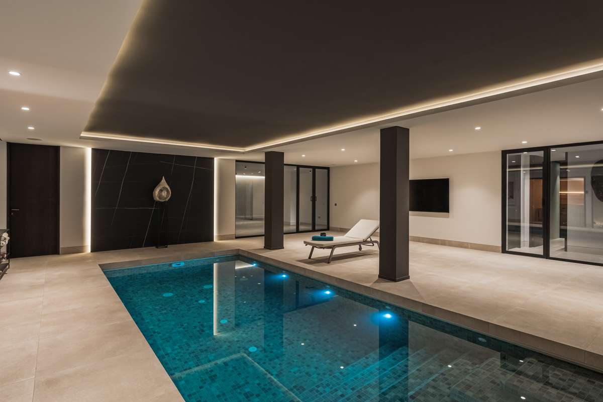 The outdoor spaces are designed for both relaxation and entertaining, with a heated indoor pool, Turkish bath, Jacuzzi, and a covered terrace offering spectacular views.
