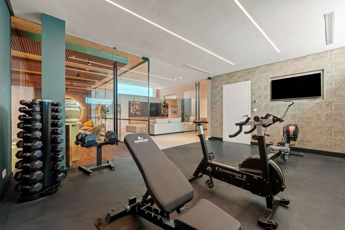 An entire level of the property is dedicated to leisure and wellness. It includes a fully equipped gym, spa facilities, and an indoor pool with modern finishes. A separate entertainment room provides additional versatility, perfect for a cinema, games, or social gatherings. The integration of these features transforms the property into a complete lifestyle residence.