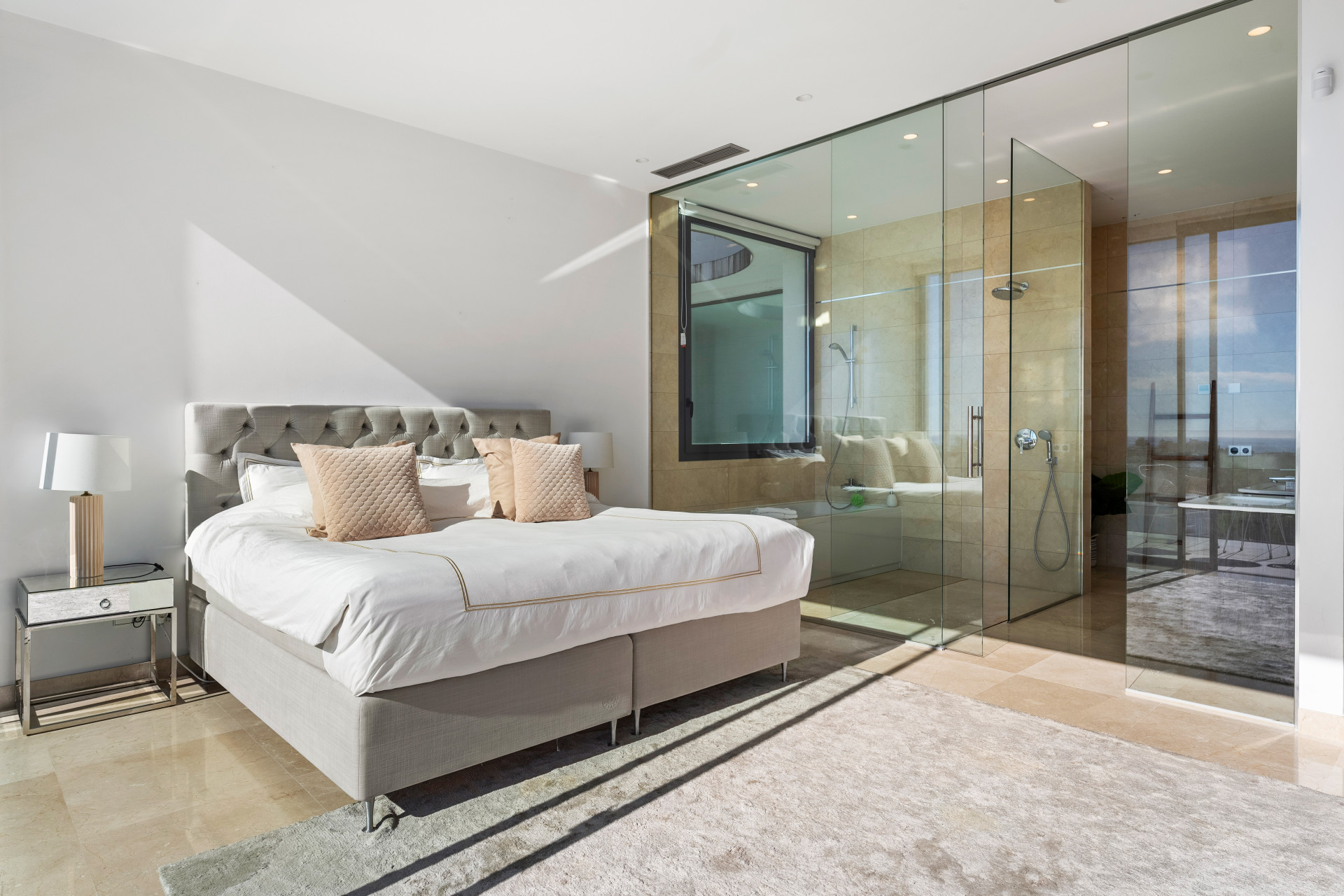 The ground floor includes one en-suite bedroom and a guest toilet, while the first floor hosts three additional en-suite bedrooms. Each of these bedrooms enjoys direct access to a terrace with mesmerizing sea views, and the bathrooms are sleek and contemporary in design.