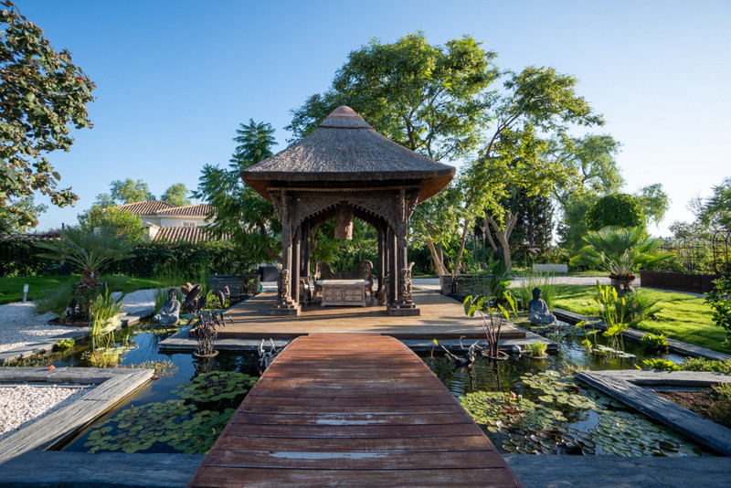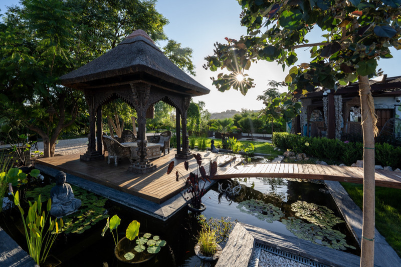 Out into the gardens this exquisite villa reveals its true self through its flora and fauna, inextricably united by your senses. A hybrid grass only needs cutting twice a year delicately caresses underfoot, a Japanese stone garden offers a sense of strength, an aviary shaped olive trees adds a sense of freedom, and a fruit garden bears tomatoes, bananas, avocados and pomegranates. In the centre an ancient Bali temple sits within a fish pond, linked by a wooden bridge, offering respite from the heat of the day whilst taking shelter under the trees that tower overhead.