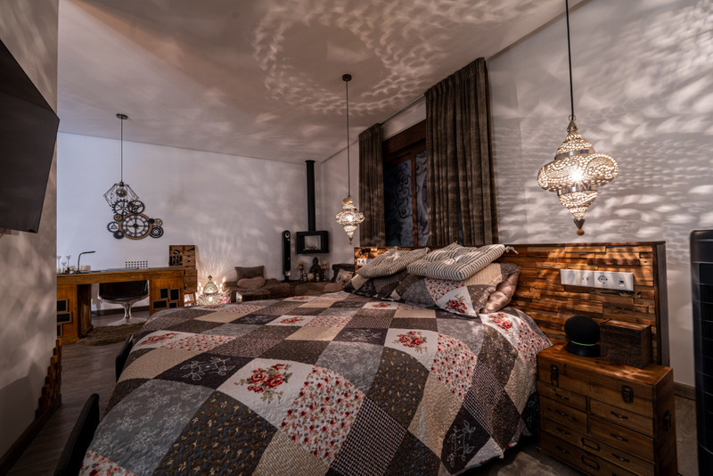 The hallway pulls you in as if to never let you go. An ornate wooden door leads through to the first of the two master bedrooms, ingenious in its use of wood and natural stone. The ensuite bathroom is open, the shower cosy in its glass cubicle with an ornate sink opposite. The bed looks through the terrace doors that offer access to the oasis outside. A side door takes you through into the walk in dressing room, sleek with illuminated glass doors and furnished with bespoke furniture.
