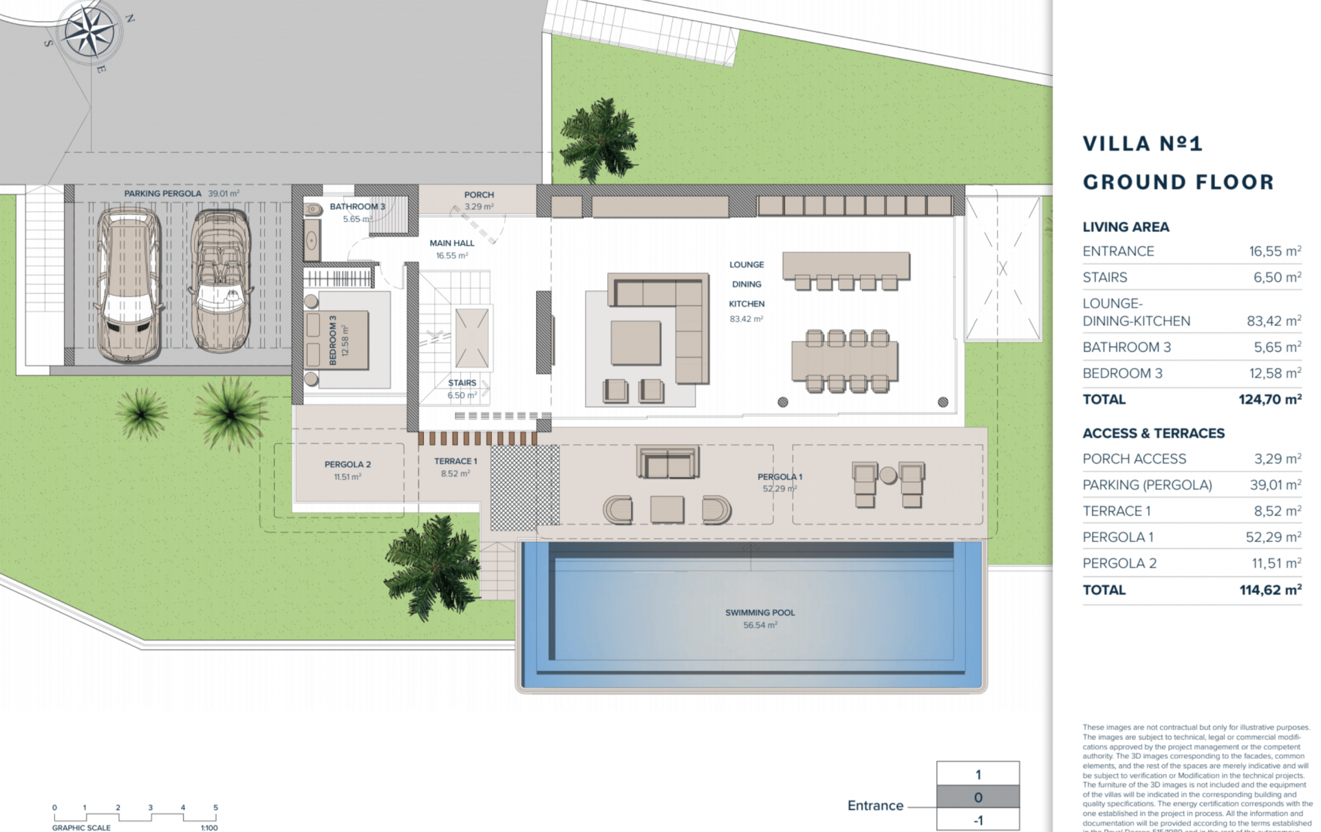 All villas have generous pools, starting at 56 m2 and going up to 116 m2.
