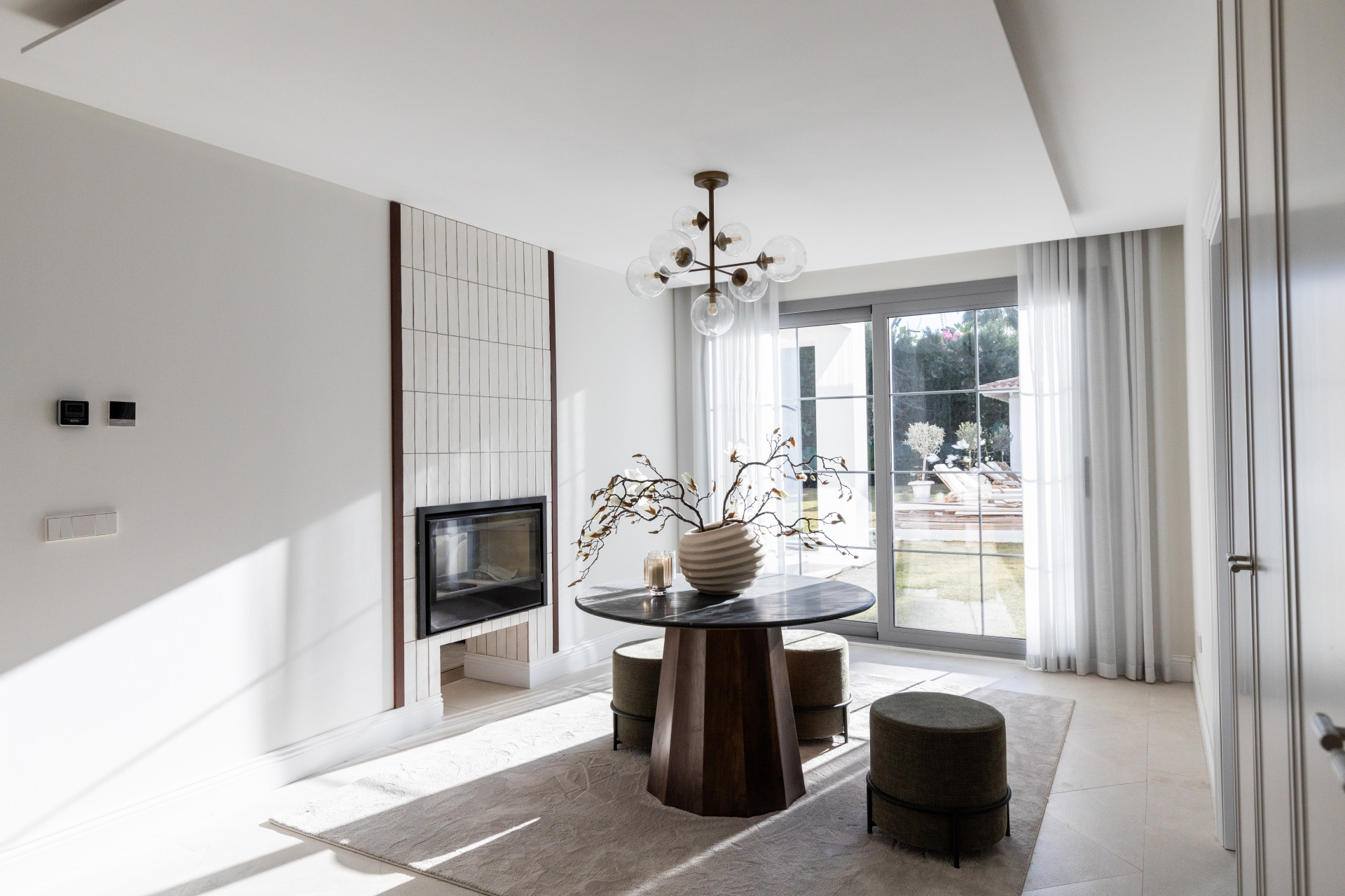 The villa features elegant, light-filled contemporary architecture, with an open-plan layout that seamlessly connects indoor and outdoor spaces. The main living area opens onto a spacious terrace and a landscaped garden with a swimming pool and a covered dining area, designed for enjoyment throughout the year.