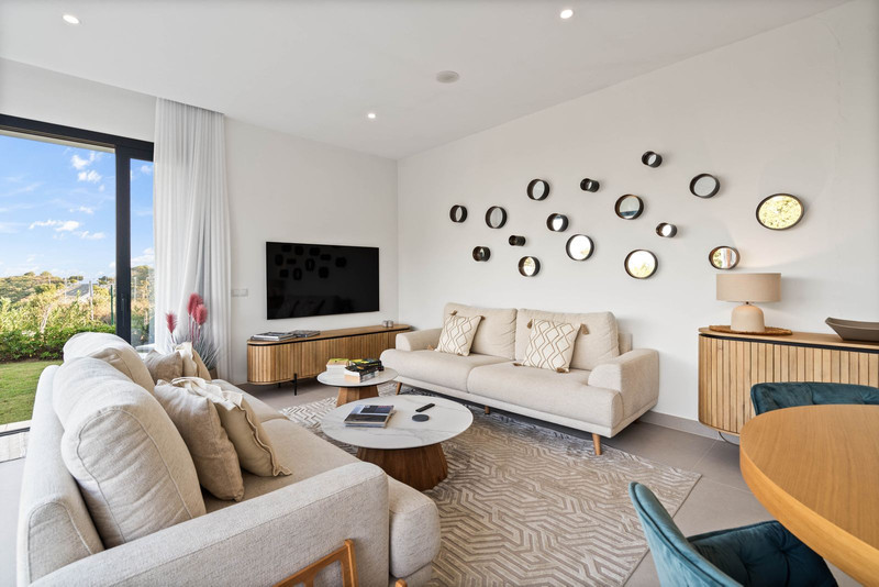 The homes are built on a sunny hillside and offer a breathtaking 180-degree panoramic view, stretching from the mountains of Marbella to Gibraltar and the Moroccan coastline. The property exudes modern luxury with an open living concept, a fully equipped kitchen, a dining area, and a cozy living space with large windows that perfectly frame the view.
