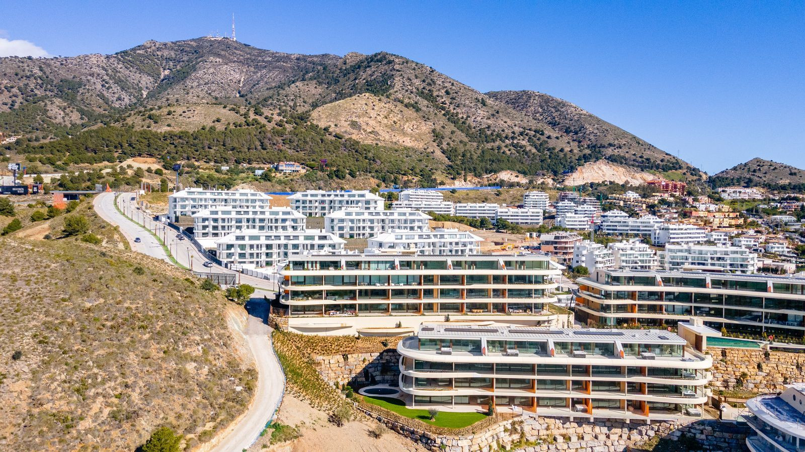 The development spans 20,000 m² of landscaped grounds, with six swimming pools and lush Mediterranean vegetation. Buildings are strategically positioned on elevated platforms to maximize light, views, and privacy, creating a tranquil setting to enjoy spectacular sunsets.