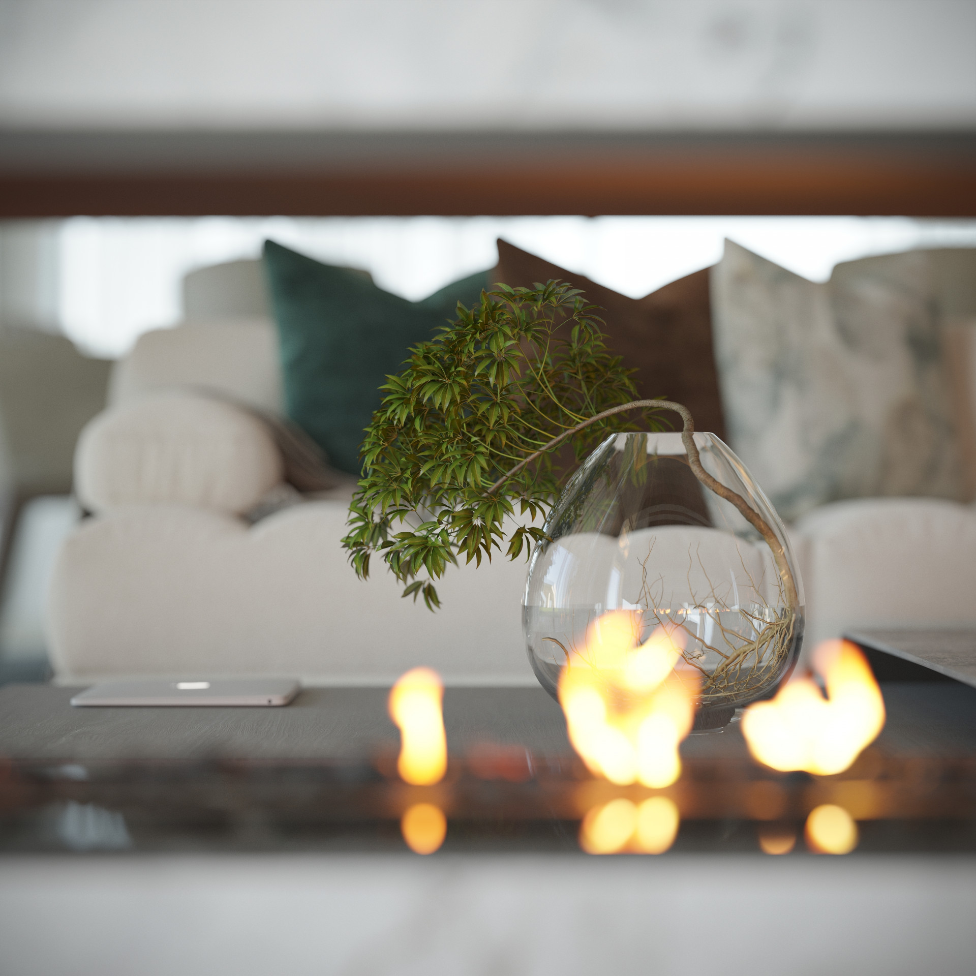 Enter the house via a bridge across a lake of water on each side which cascades down to the lower level.