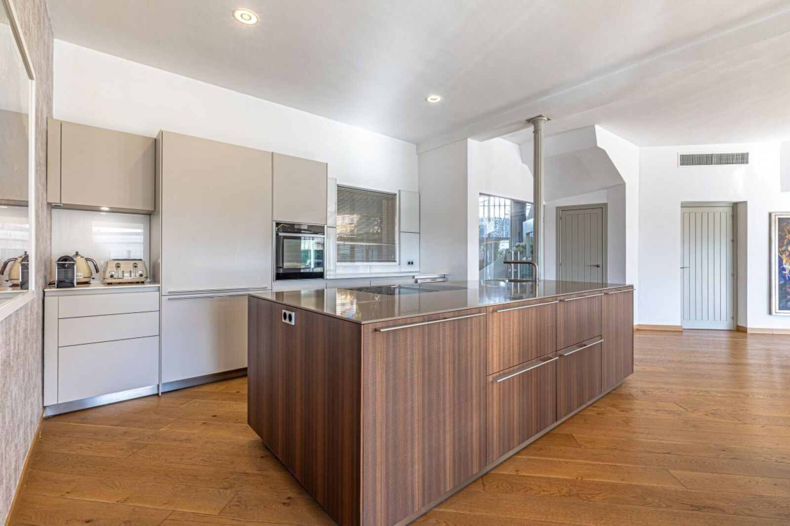 The main level welcomes you with a bright living room featuring a fireplace, a separate dining area, and direct access to covered and open terraces overlooking the garden and pool. A fully fitted Bulthaup kitchen provides ample storage and workspace, ideal for everyday living and entertaining. The villa offers five well-proportioned bedrooms, including a spacious master suite, and several bathrooms finished in a modern style.