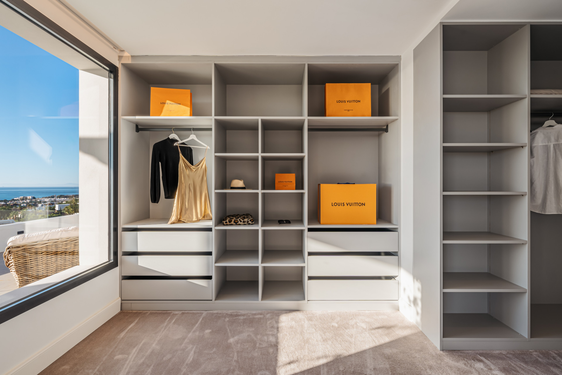 On the first floor, the en-suite master bedroom offers a serene retreat with a private bathroom, featuring a freestanding bathtub positioned to capture the views, access to the large terrace, and an expansive walk-in closet. Two additional en-suite bedrooms on this floor ensure comfort and privacy for all family members.