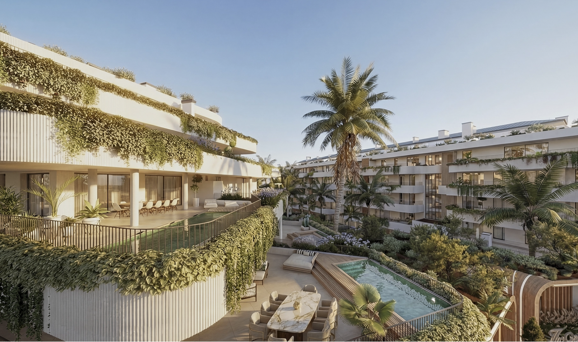 From a distance, the complex is distinguished by its clean architecture, generous terraces, and a constant presence of light and nature. Up close, it reveals a complete universe of well-being, leisure, work, and personal care, integrated into a modern urbanization, on a human scale and with a clear international vocation.