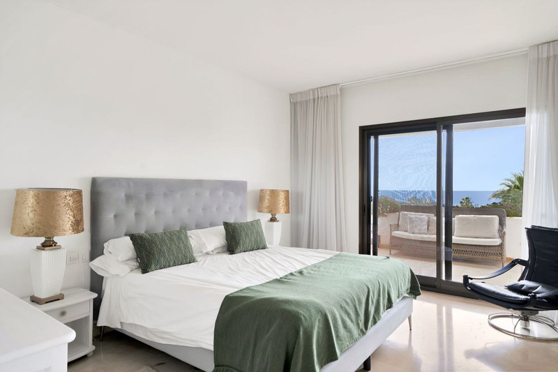 This luxurious penthouse, located on Marbella’s prestigious Golden Mile in the Coral Beach complex, epitomizes beachfront living. The property features three spacious bedrooms and two elegant bathrooms, providing ample comfort and privacy. The highlight is a 74 m² terrace with breathtaking panoramic sea views, ideal for outdoor dining and relaxation. The interiors are bathed in natural light, complemented by a modern open kitchen with stunning mountain views. Residents enjoy access to lush tropical gardens, a large communal pool, and direct beach access. The penthouse also includes underground parking and storage space. Its prime location offers proximity to renowned restaurants, luxury hotels, and prestigious golf courses, making it perfect for those seeking a sophisticated Marbella lifestyle.