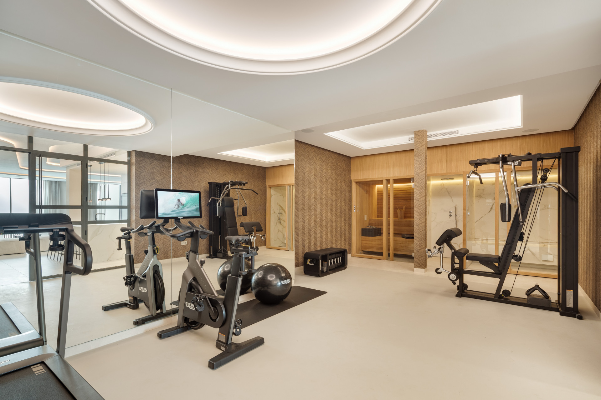 In the basement, Villa Imagine continues to impress with a fully fitted techno gym, a sauna, and a steam room, creating a private wellness retreat. The basement also features a second living room with full windows that let in natural light, eliminating the typical basement feel. This space includes a bar with a stone wall backsplash, a home cinema, and additional bedrooms, making it a versatile area for relaxation and entertainment.