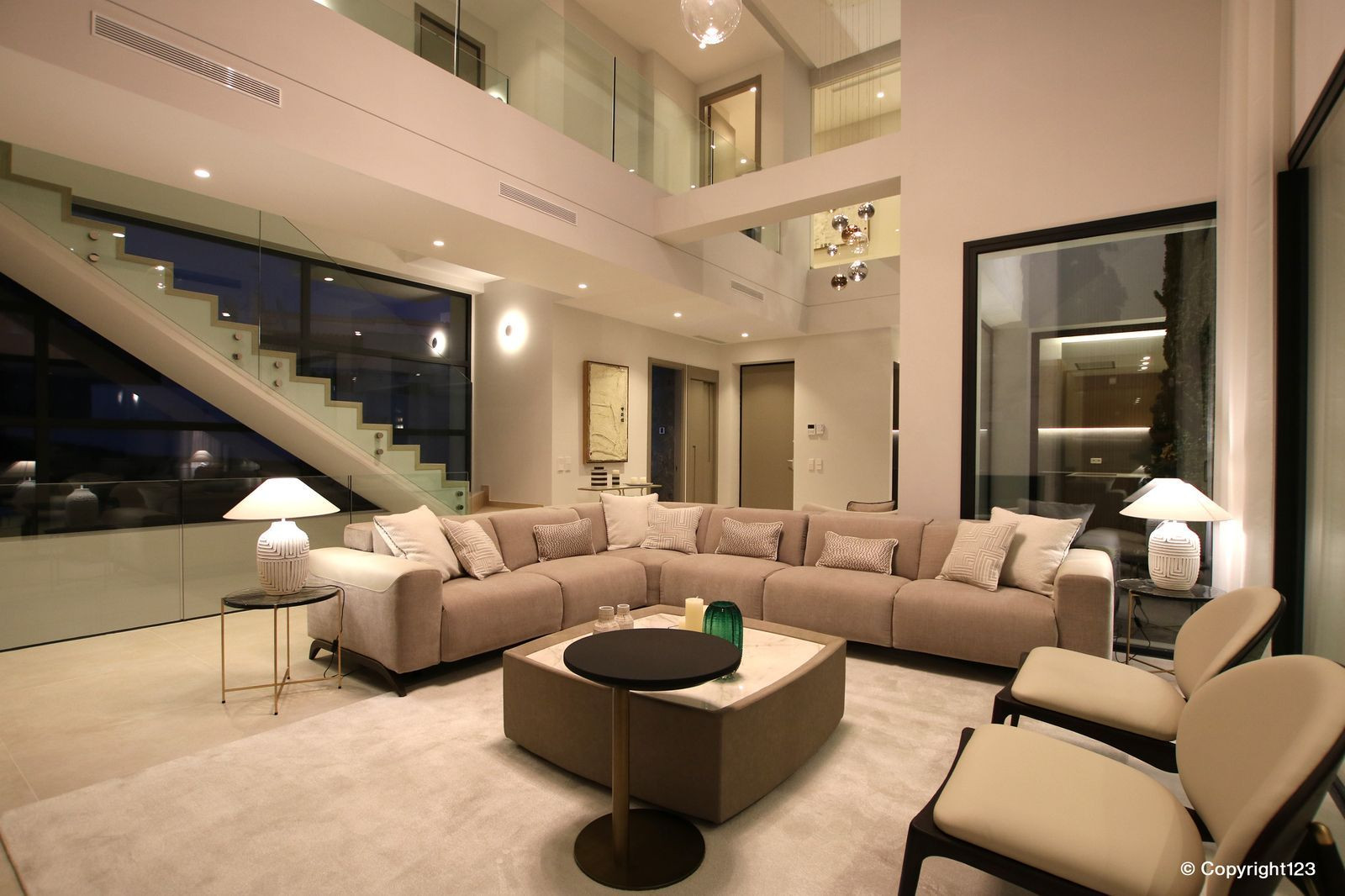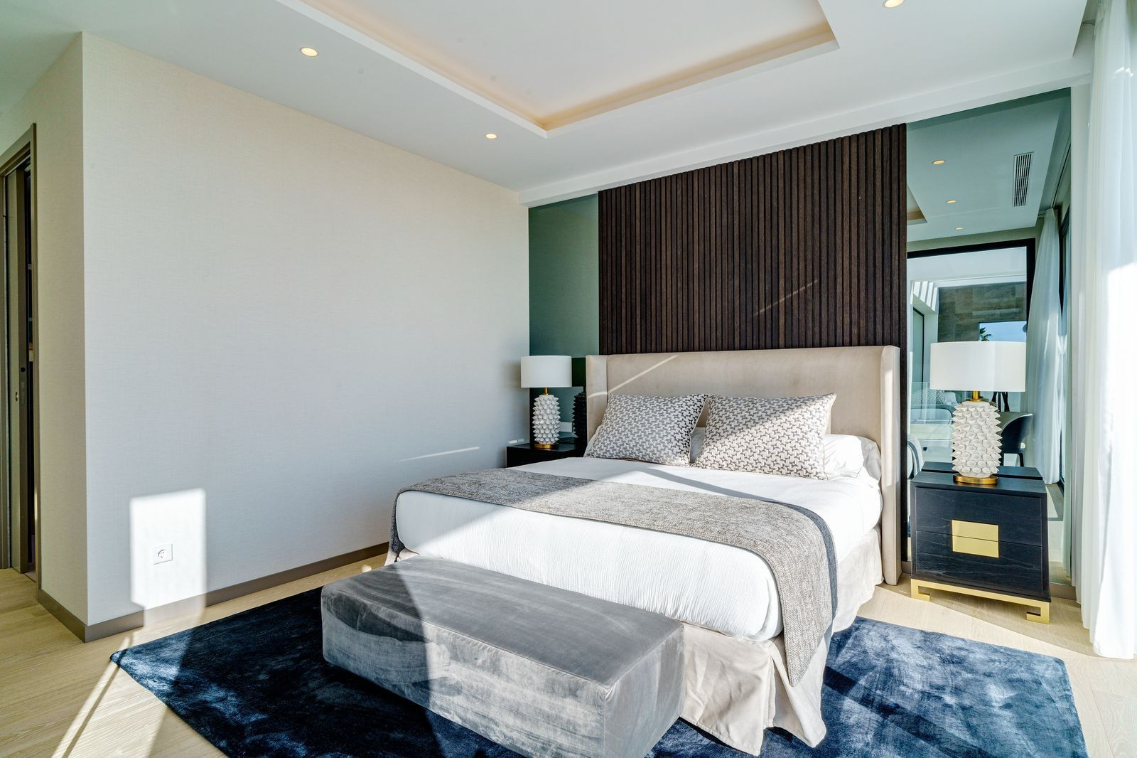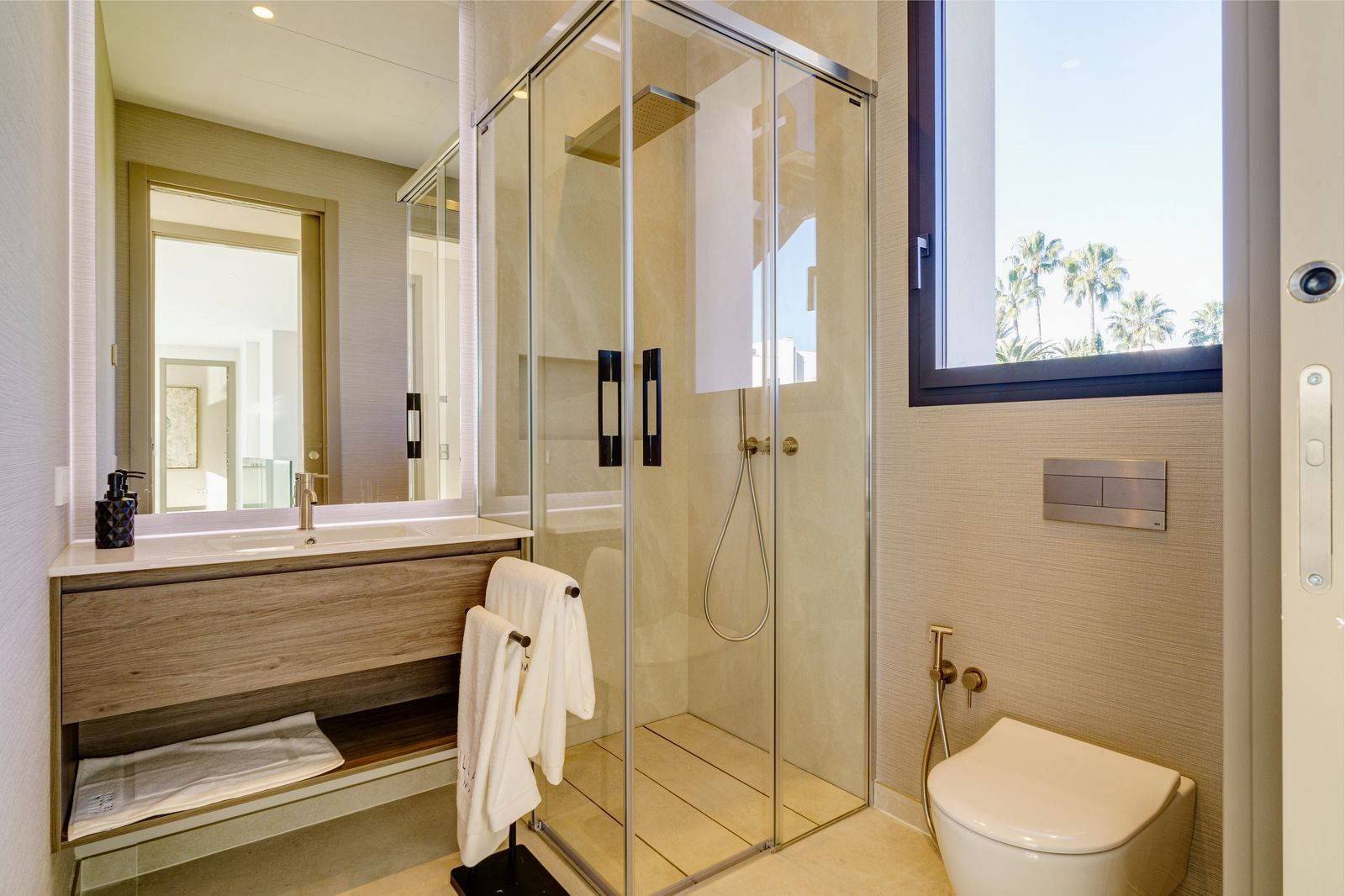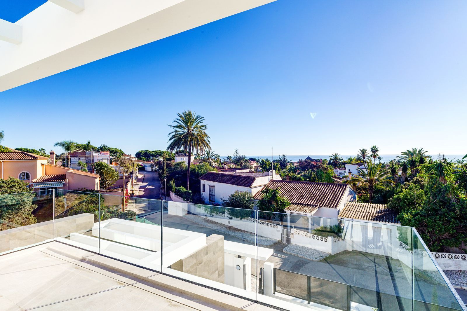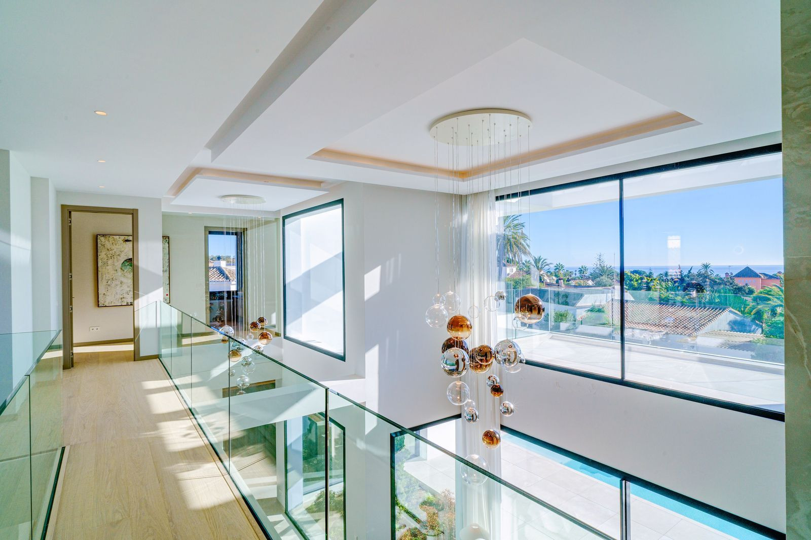 The wide attractive staircase with glass railing takes us to the first floor, where there are two fabulous bedrooms with en suite bathrooms, dressing room and access to the terraces, which in turn leads to 100m2 of solarium on the top floor via a specially designed stair case.