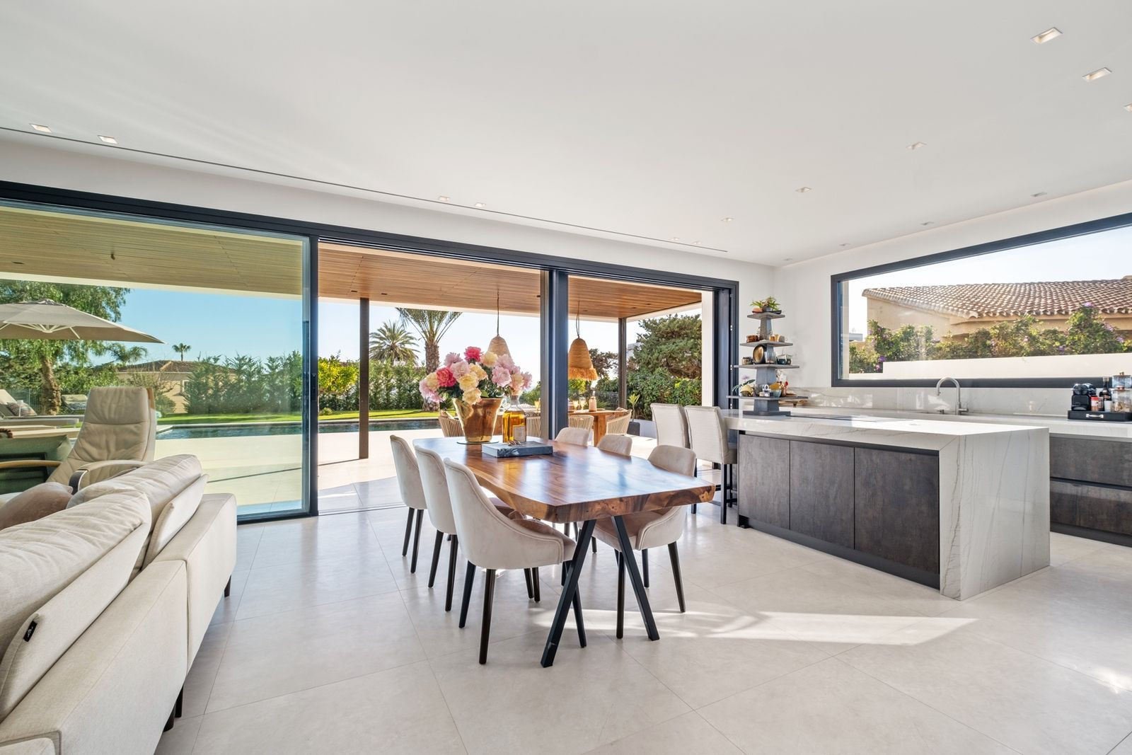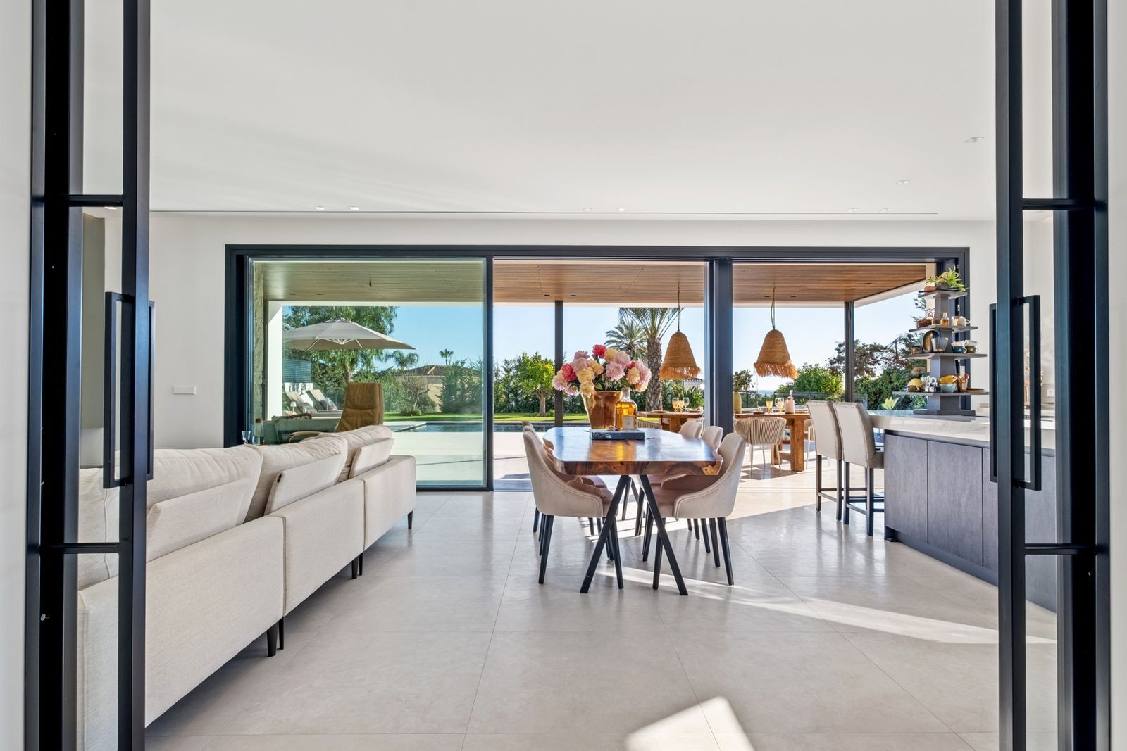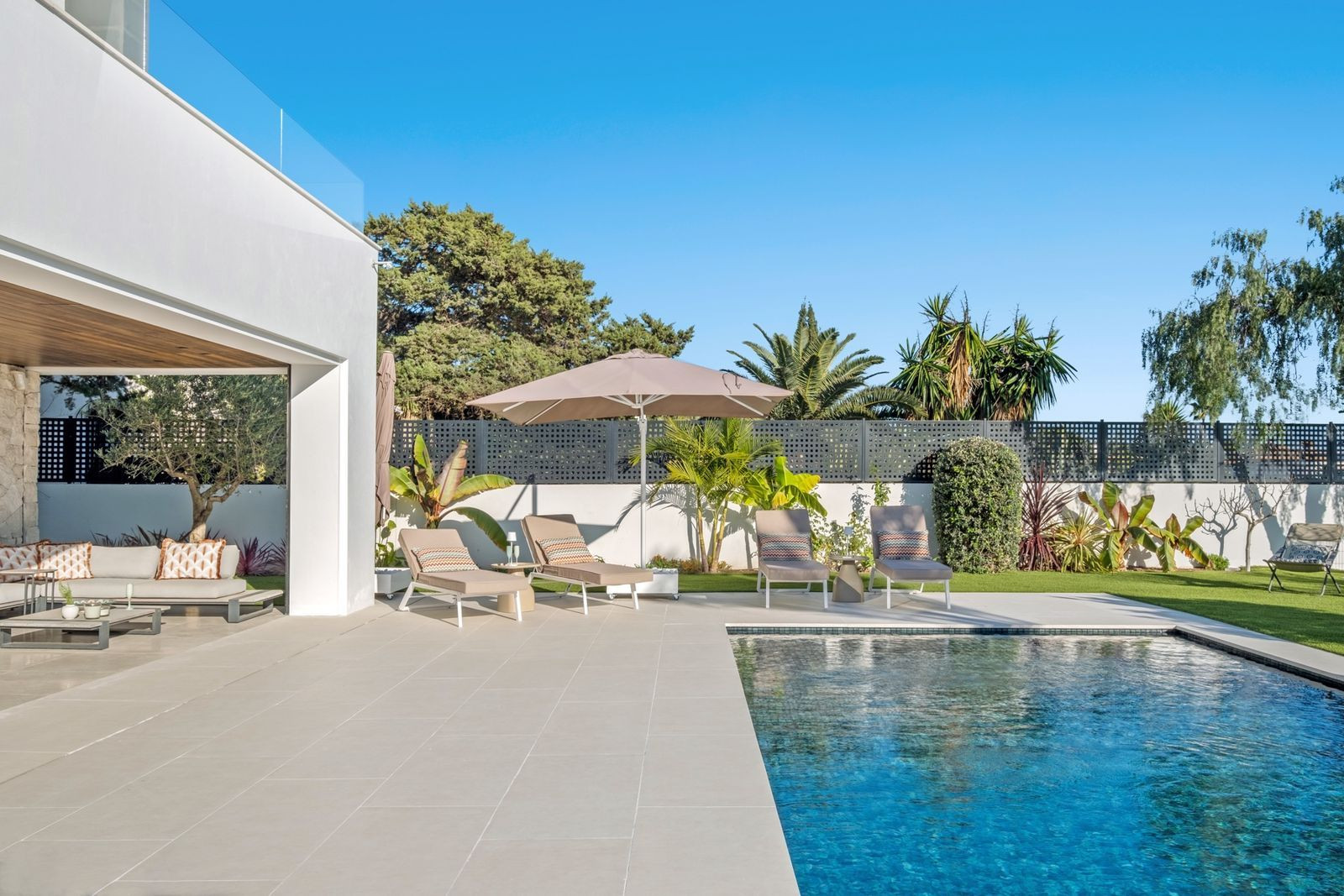 With a layout that encourages seamless flow between indoor and outdoor areas, the villa offers expansive terraces, perfect for entertaining or relaxing. The pool, with its Bali-inspired colour, becomes the visual centrepiece of the garden, designed for minimal maintenance (only €250/month for weekly upkeep garden and pool). Additionally, the property features electric awnings and automatic mosquito screens all around the covered terrace, ensuring privacy and comfort year-round.