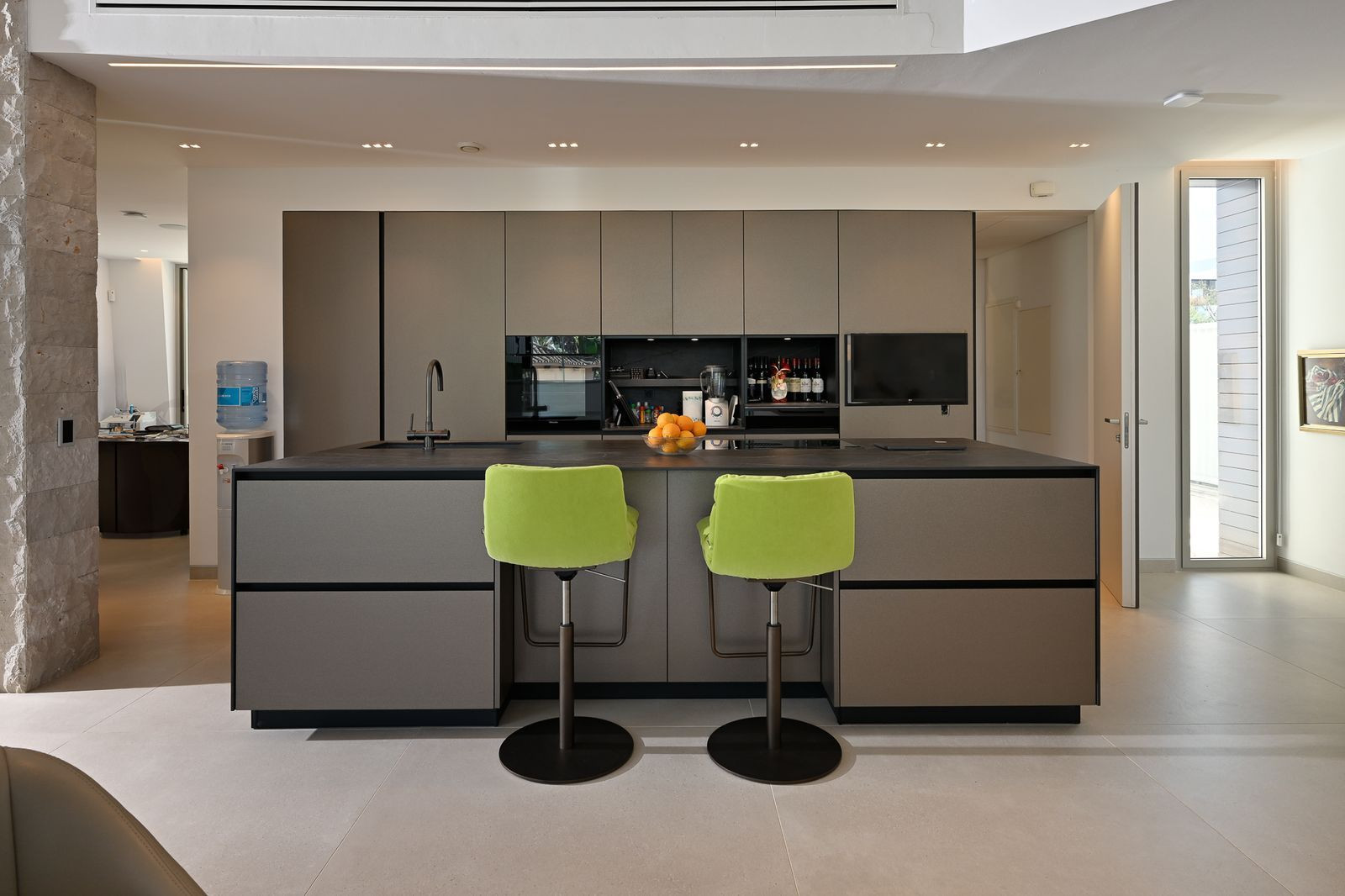 The lower level offers three additional bedrooms, each with its own en-suite bathroom. This floor also includes a versatile open space, ideal as a second living room, office, or playroom, as well as a lounge and a fully equipped second kitchen.