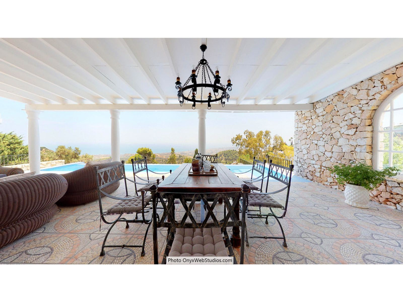 The Plot is 6092 sqm with mature garden. Impressive entrance driveway from street is leading to the villa. Villa at approx. 1.135 sqm with entrance hall leading to a large lounge with high ceilings and a fireplace, dining area and 3 doors out to the partly covered terrace with beautiful sea views and an infinity pool with heating.