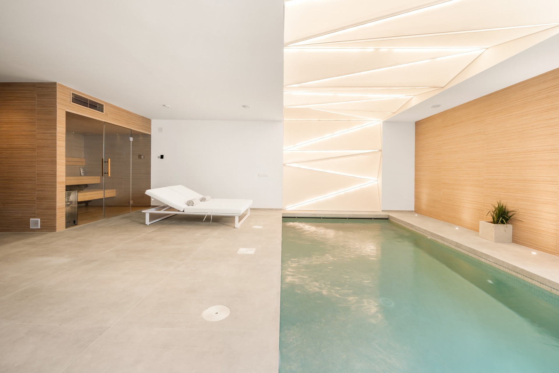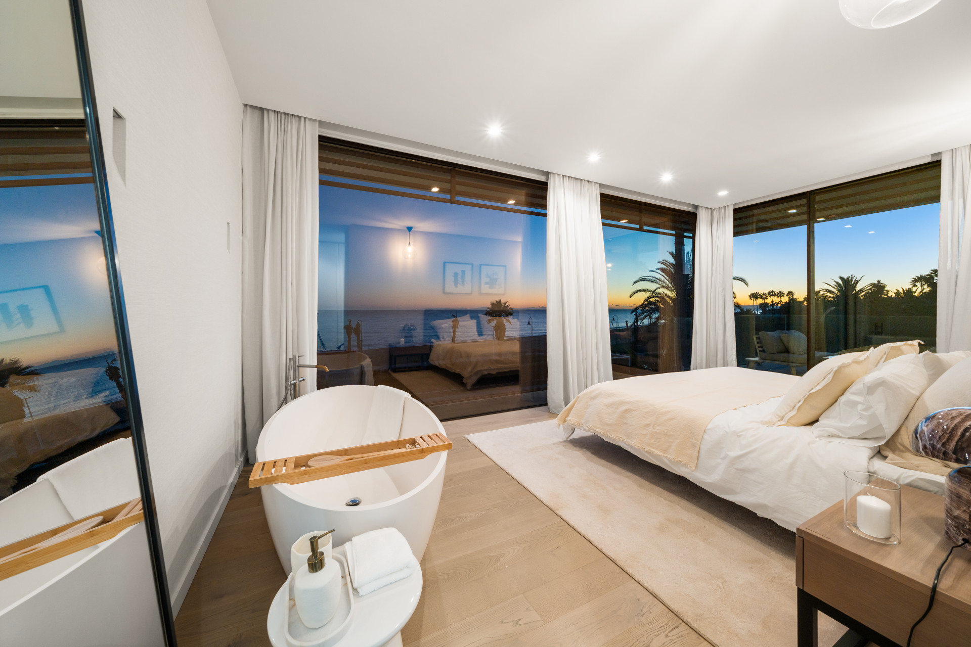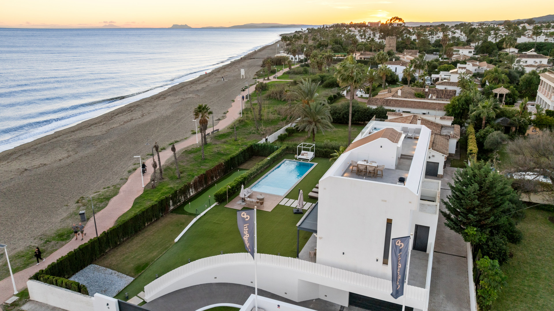 Boasting of panoramic sea views, a contemporary showpiece villa sitting in a privileged beachfront position in the New Golden Mile, surrounded by an expansive private garden with a large private swimming pool. The ideal family estate offering a dynamic outdoor lifestyle, perfect for water sports enthusiasts, with direct access to the beach from the front garden.