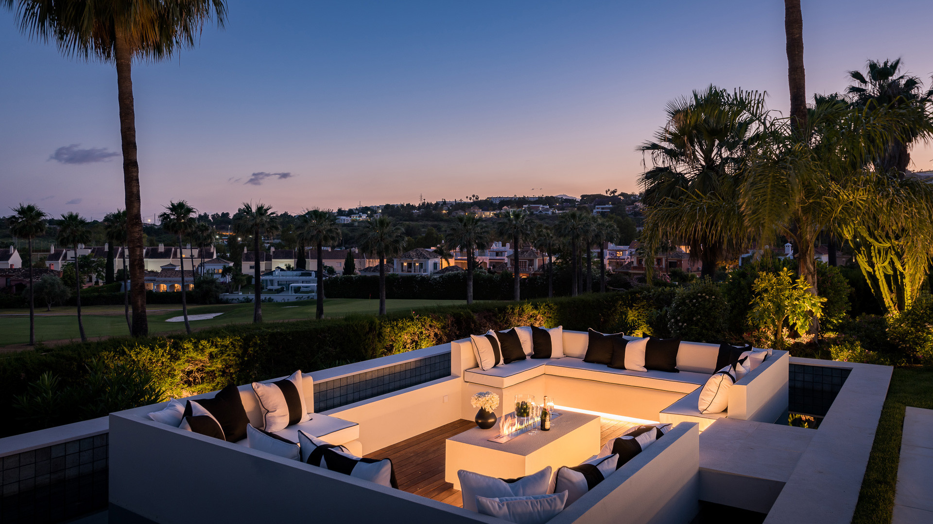 Spectacular villa designed by a well-known award-winning architect located in a privileged setting in the heart of the Golf Valley of Nueva Andalucía, one of the most sought-after residential areas on the Costa del Sol. This southwest-facing villa is distributed over three floors and comprises, on the entrance level: bright hall leading to a huge open-plan living area divided into three seating areas, Italian designer kitchen fully equipped with Gaggenau appliances and dining area. All leads to a spacious porch, the beautiful landscaped gardens with a stunning chill out zone with water features, the extra sized heated pool with outside shower and plenty of space to sunbath and the outside BBQ kitchen – all with stunning views over the the golf course. Upstairs: master bedroom with a huge elegant wardrobe, en-suite bathroom and access to the terrace to enjoy the views, even from the bathtub; further suite; 2 bedrooms sharing a bathroom. All bedrooms have spacious built-in oak wardrobes. Lower level: 2 more bedrooms; laundry room; wine cellar; gym and a home-cinema. Built to the highest specifications and finishes, including bathrooms with Dornbracht fittings to mention a few. Quietly located, undisturbed, on an elevated plot on the golf course. Situated only a few minutes’ drive to the renowned Aloha international college and Aloha, with its rich selection of restaurants, bars and amenities. Only 5 minutes’ drive to Aloha Golf, Las Brisas Golf, La Quinta Golf, Magna Marbella Golf, and a wide selection of tennis and paddle tennis courts. Only 10 minutes’ drive to Puerto Banús, the beach and Marbella’s Golden Mile.