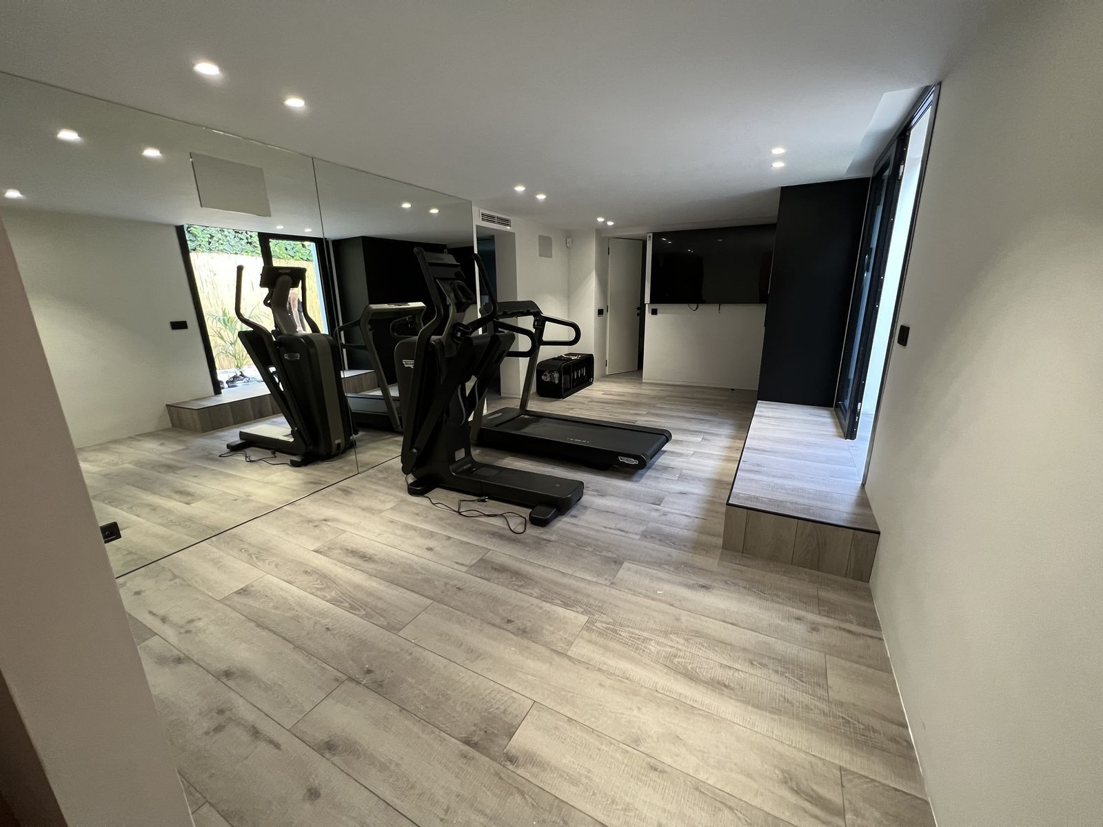 It is worth mentioning a 7 × 3 saltwater pool, a sauna for 8 pax, a Technogym fitness on the ground floor next to the home cinema and another game area with a bar. Environmentally friendly and energy efficient property in excellent condition, with home automation system, underfloor heating in bathrooms, air conditioning, double glazing, fitted wardrobes, dressing room with lighting, separate guest toilet, carport for two cars
