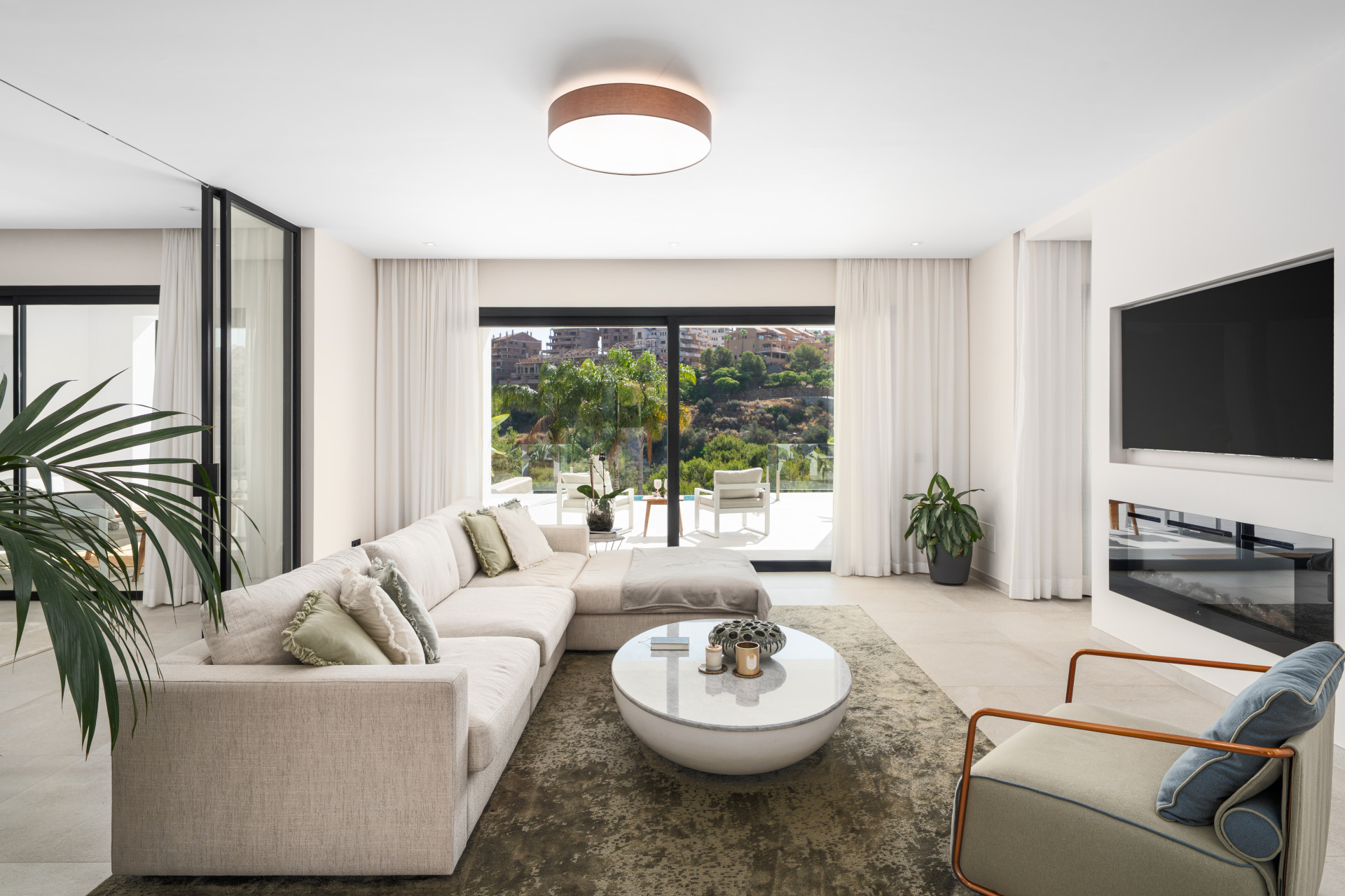 Each floor flows effortlessly to the next, with expansive terraces accessible from all bedrooms and common areas. Outdoor spaces include a covered swimming pool, private barbecue zone, and a sauna—ideal for entertaining, family life, or quiet relaxation. Panoramic views over the Santa Maria Golf course and out to the Mediterranean Sea reinforce the villa’s prime positioning and tranquil atmosphere.
