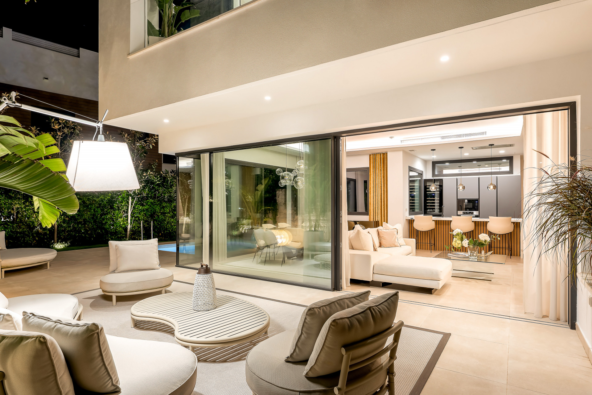 Located in the prestigious area of Sierra Blanca offering a prime location, the highest of qualities and details through-out, sea views from every single level and located only 1.8km from door step to beach of the Golden Mile. This stunning unique modern home was recently built and completed in 2022 and offers true luxury living within one the best and most sought after areas of Marbella. The moment you enter the property you instantly see and feel the qualities throughout. A modern bespoke kitchen with fully integrated Miele appliances throughout greets you, connecting you with the open plan living and dining area which flows directly out into the expansive terrace, pool and garden area. Due to the properties south/south-west and west orientation, sunlight floods the property which is enhanced by the floor to ceiling widows and doors. Only the best brands and materials have been used, with the likes of Porcelanosa tile flooring indoor and out, Cortizo terrace doors and windows with triple glazing, Porcelanosa washroom hardware, underfloor heating throughout the entire property, zonal AC systems and lighting operated via the domotic systems, built in cinema grade sound and entertainment systems, oak carpentry and ambient lighting through-out amongst more. The main terrace and garden areas seamlessly flows from indoor to outdoor and here you find several outdoor seating and relaxing areas. A beautiful stone wall with built in atmospheric lighting and Mediterranean planting such as aromatic herbs and plants, orange, lemon and lime trees offers a cosy and intimate feeling. To the rear a low maintenance garden with magnolia trees offers you greenery and a fantastic aspect view of the property. The pool has been strategically placed ensuring sun all day long, which is also heated and installed with a swim current machine, meaning endless lengths all day long for keen swimmers. The properties distribution offers 3 bedrooms up and 1 down. From the main living area you can either take the stairs up or down or alternatively use the internal Tyssenkrupt lift which takes you to each level of the property. On the upper bedroom level here you find the 3 bedrooms comprising of a master with ensuite, and 2 further bedrooms sharing a bathroom, with bathrooms fitted out in Porcelanosa and high end finishes. Each bedroom has its own terrace space all offering fantastic sea views and relaxing seating areas to unwind. At the lower level of the property you find a bedroom with ensuite bathroom, utility/laundry room with Miele appliances, storage space and a closed off large private garage. The garage has been installed with a Tyssenkrupt car turn table, ensuing manoeuvring cars in and out an easier process, space on the covered gated drive way outside also allows for a further car to be kept. The piste de resistance of the property is the enormous roof top solarium. Not only does it offer the best panoramic sea and mountain views you can find in Marbella, it also offers coastline views from Puerto Banus to Gibraltar to North Africa. Added to this an incredible entertainment, wellness and relaxation area, fully fitted out with a Balinese bed and seating area a automated retractable roof cover, heating panels, speaker systems, full outdoor dining area for 8-10 people, outdoor teppanyaki grill, Porcelanosa kitchen area with fridge, dishwasher and island, large jacuzzi, outdoor shower and a bespoke high quality Scandinavian sauna with built in Bluetooth, positioned due South giving you the most astonishing sea views. With location, qualities, views, garage space and overall luxurious and high end living, this is a truly exception and rare opportunity to purchase.