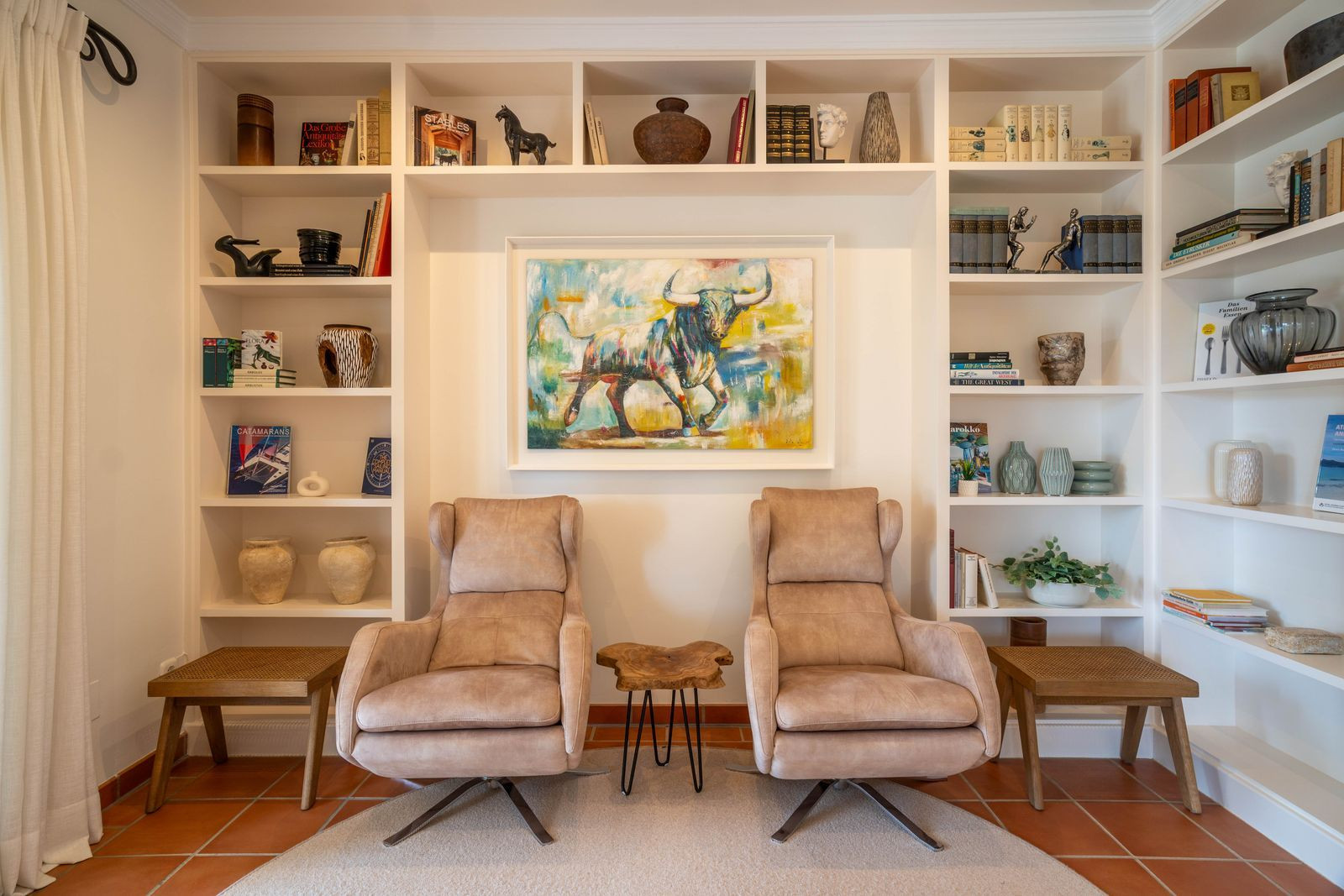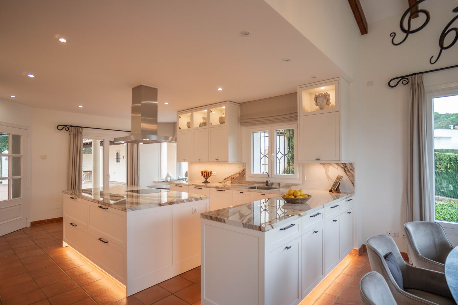 A library / TV room offers a cozy retreat, and two bedrooms with en-suite bathrooms plus a guest toilet provide warmth and privacy. Doors open effortlessly to the garden, swimming pool, Bellavista terrace, and private courtyard/patio, blending indoor and outdoor living.