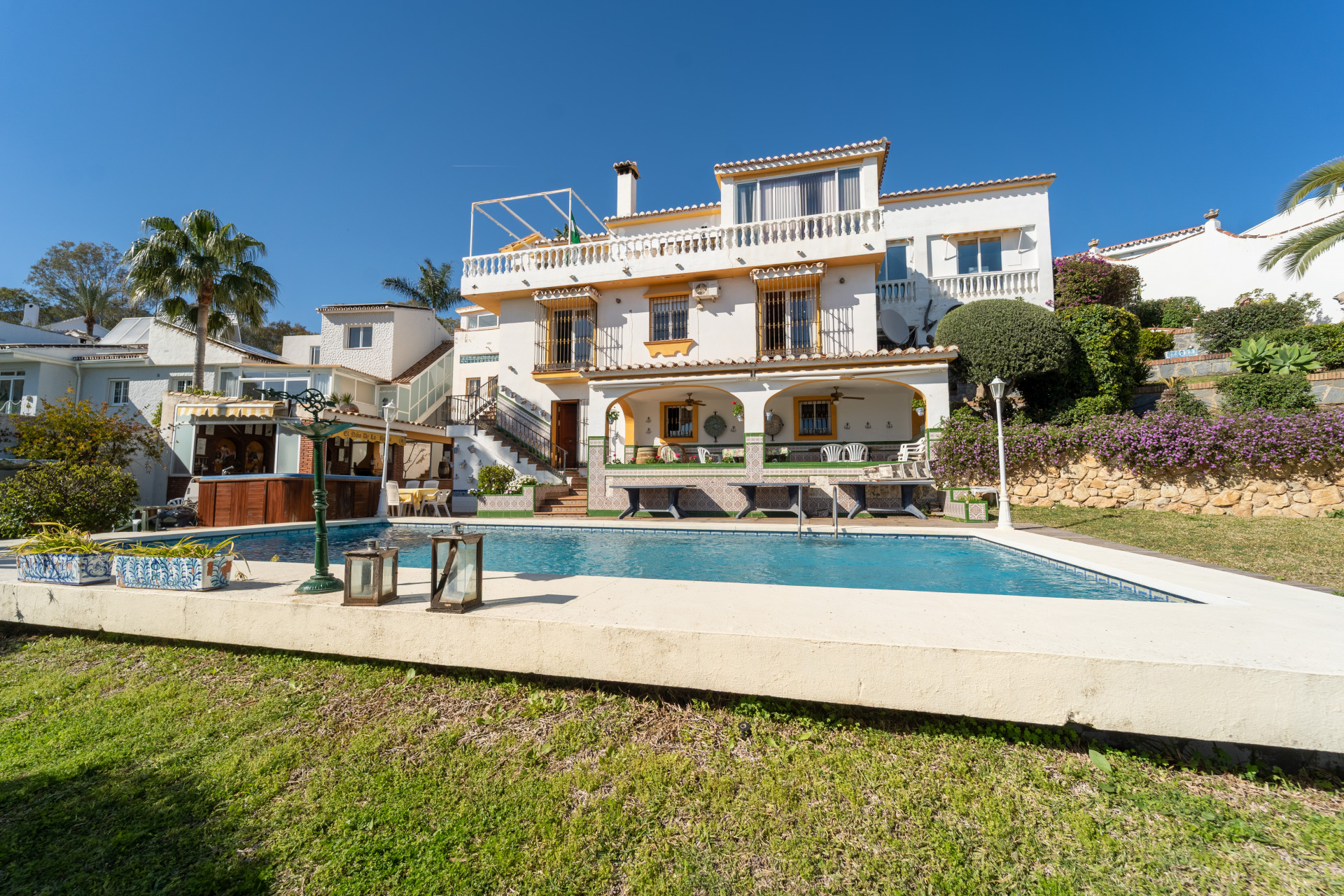 Imagine waking up every morning in a magnificent Andalusian-style villa where timeless architecture blends seamlessly with the natural beauty of the Mediterranean surroundings. Set on an expansive plot of approximately 1,500 m², this remarkable property offers an exceptional lifestyle, with breathtaking sea views that can be enjoyed from almost every corner of the home.
